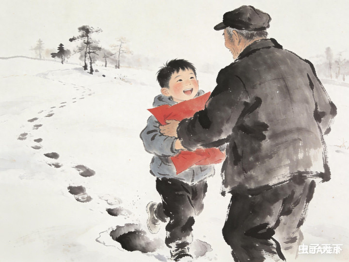 "爷爷!"孙子小宝踩着雪窝子跑来,怀里抱着红纸,"我给您写了副对联!"
